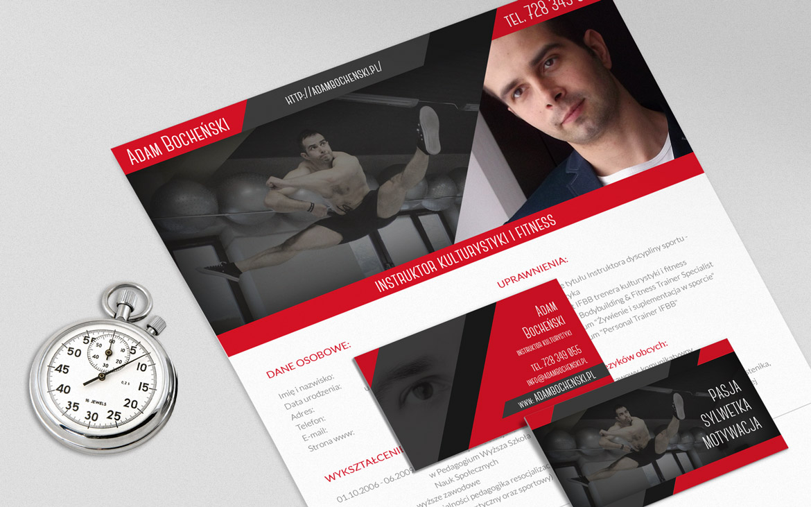 Zajęliśmy się kompleksową kreacją wizerunku instruktora kulturystyki Adama Bocheńskiego. Stworzyliśmy logo, profil kolorystyczny, wzory druków, wizytówki, kalendarz ścienny oraz grafikę do serwisu facebook.