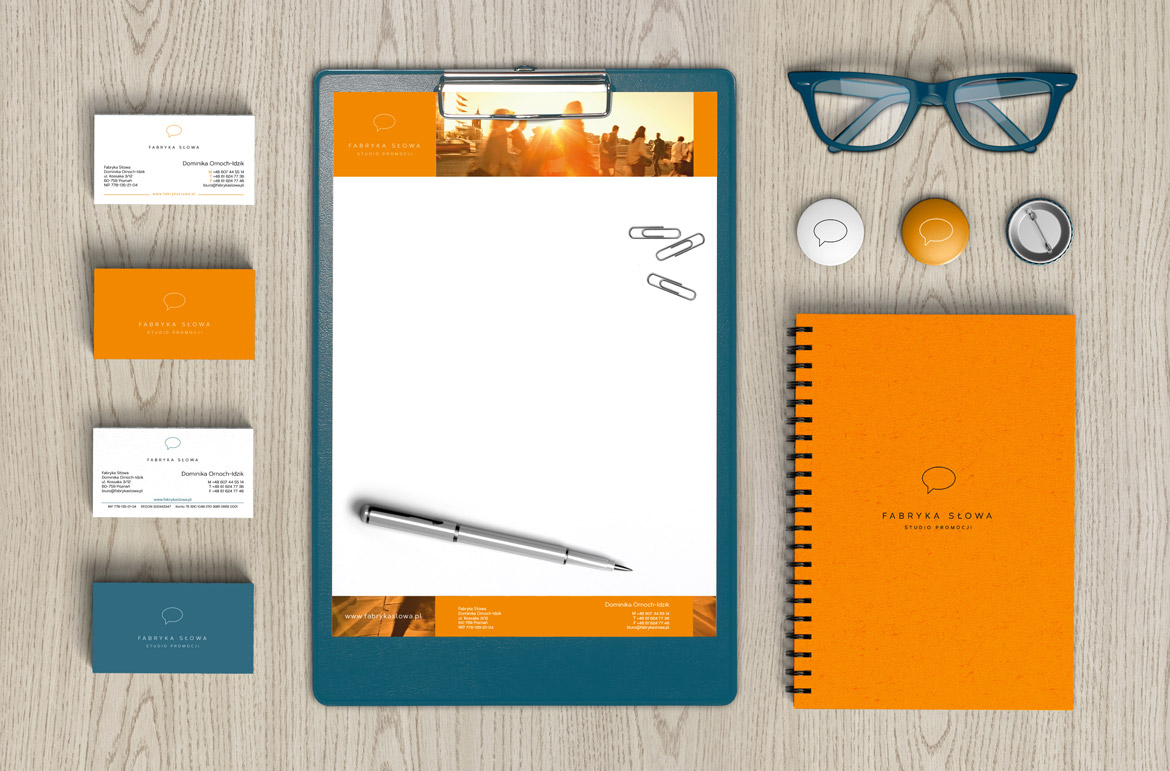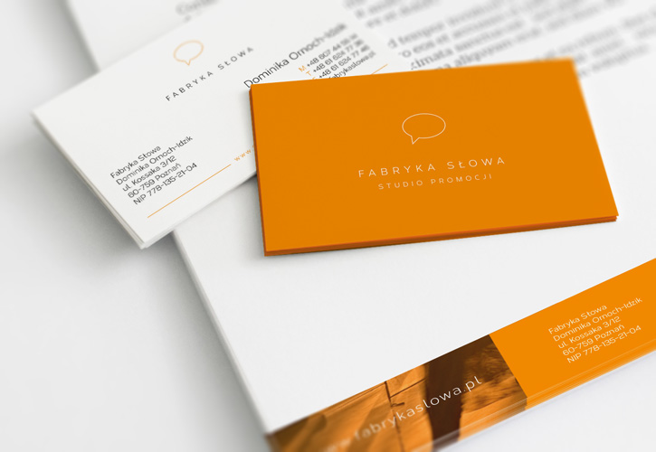 Dla agencji reklamowej Fabryka Słowa - Studio Promocji z Poznania, przygotowaliśmy dwa rodzaje wizytówek oraz szablon ofertowy. Akcydensy powstały na bazie dostarczonej nam mini księgi znaku.