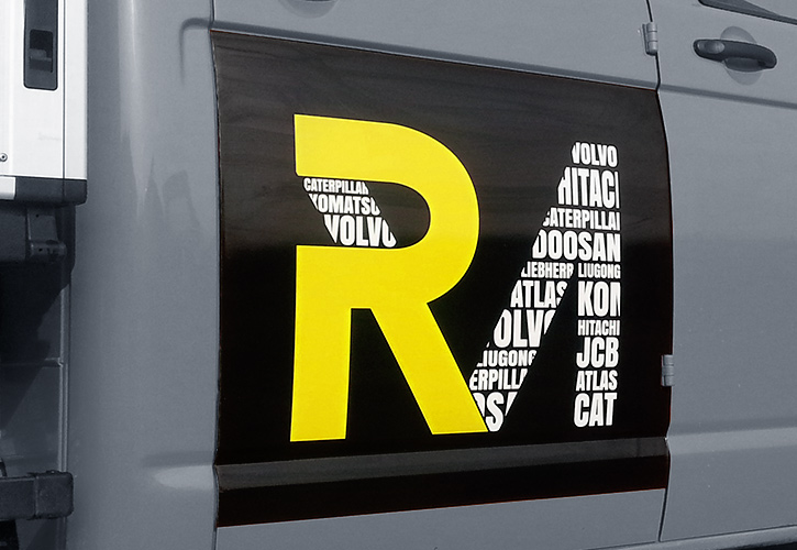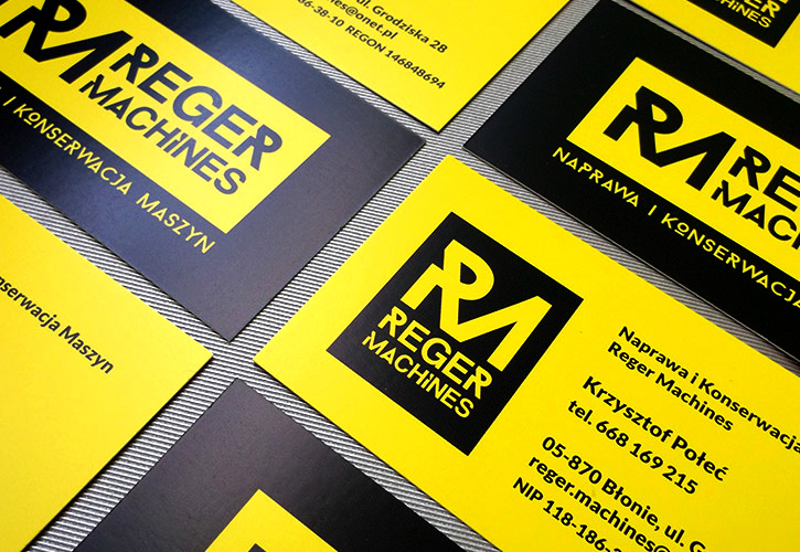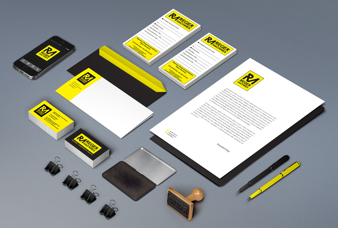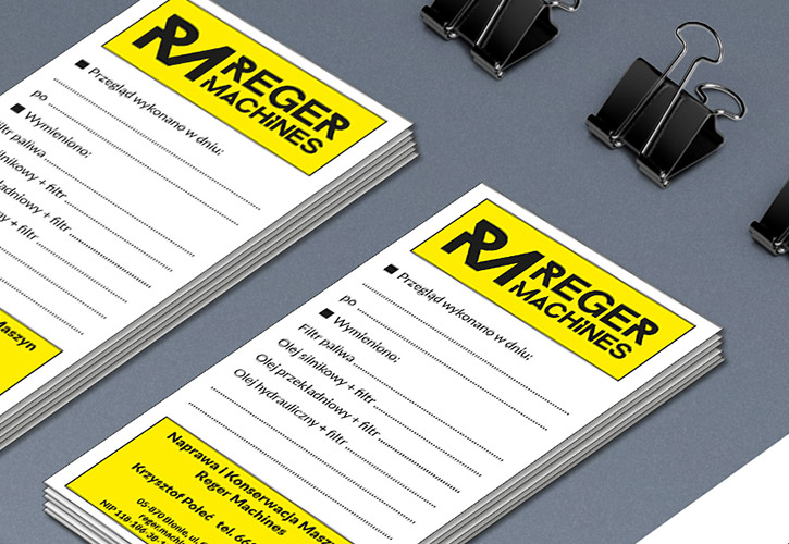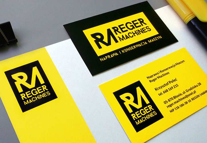 Prosty, wyrazisty branding dla firmy Reger Machines z Błonia, zajmującej się naprawą i konserwacją maszyn budowlanych. System identyfikacji wizualnej obejmuje: logo, wizytówki, papier firmowy, naklejki serwisowe oraz oznakowanie samochodów.