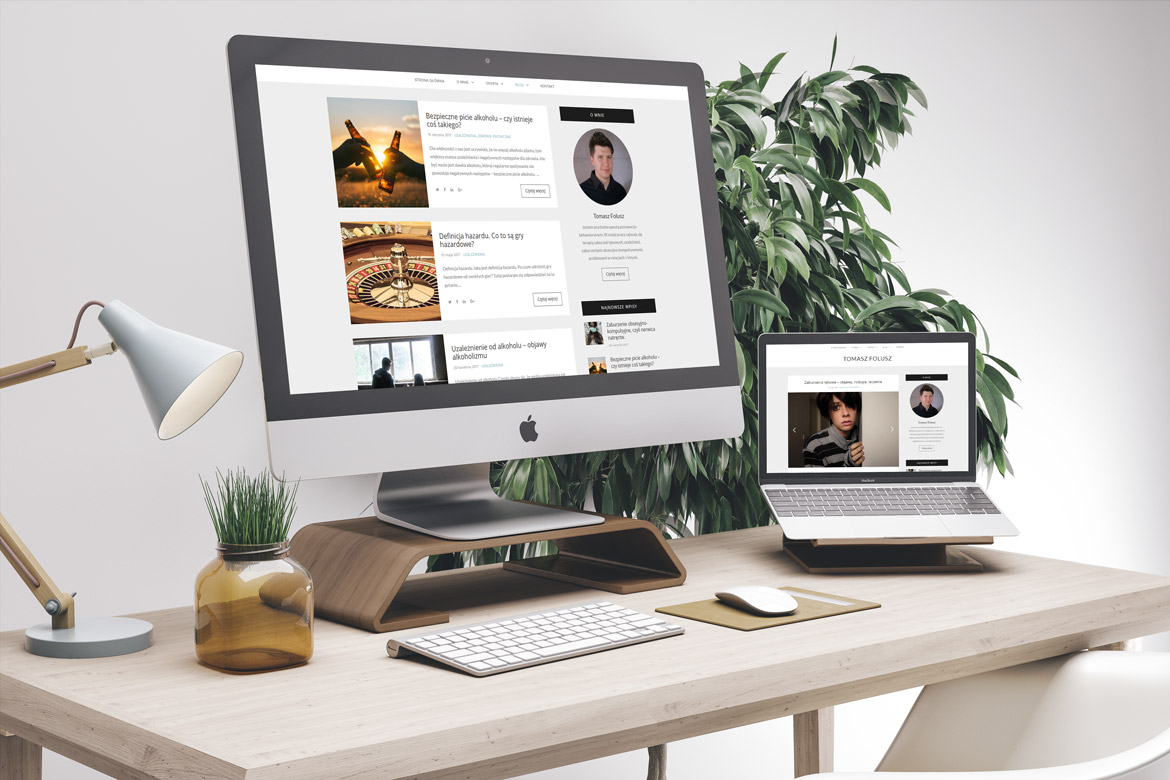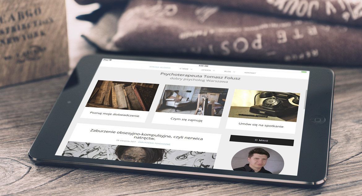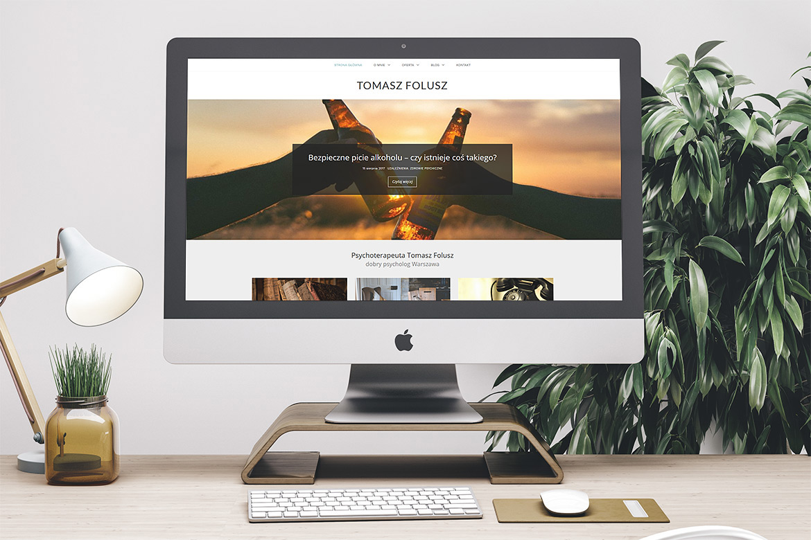 Strona firmowa w formie bloga, stworzona dla psychoterapeuty z Warszawy. Pan Tomasz bardzo lubi minimalizm i stonowane kolory, dlatego postawiliśmy na delikatne szarości, biel, czerń i akcenty w tonacji sepii.