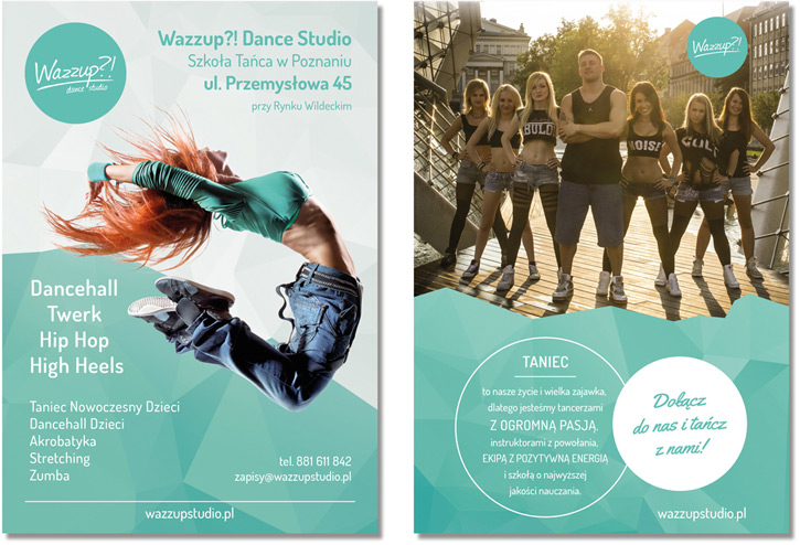 Logo, identyfikacja wizualna oraz pakiet materiałów promocyjnych dla szkoły tańca z Poznania. Wykonaliśmy m.in. stronę internetową, karnety, ulotki A5, plakaty A3, banery 2,5 x 1,5 m, wlepki, grafikę na fanpage facebook.